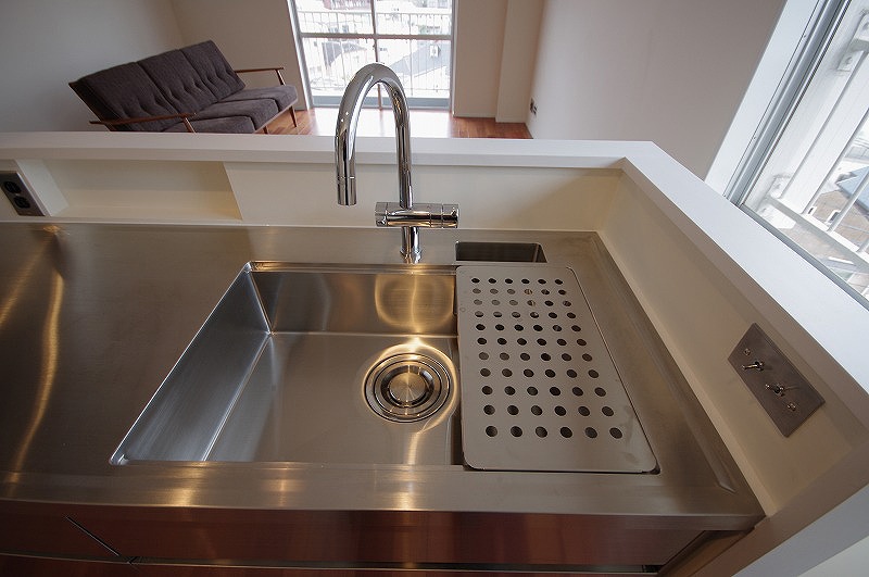 オールステンレスで収納力はシステムキッチンくらい確保できるものをということで、北沢産業さんのオーダーキッチンを選ばれました。